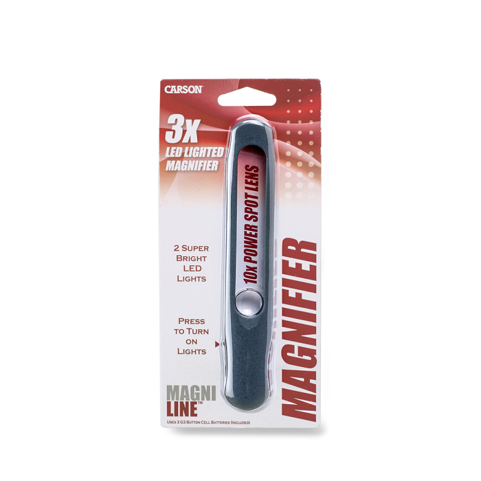 Cette règle de lecture est un outil indispensable pour tous ceux qui lisent souvent des livres, journaux ou magazines, chez eux ou en déplacement. Même en faible lumière, la Carson MagniLine reste votre alliée grâce à son puissant éclairage LED. Pour utiliser la LED, il suffit d’insérer les 3 piles LR41 fournies dans le compartiment à l’arrière de la poignée.