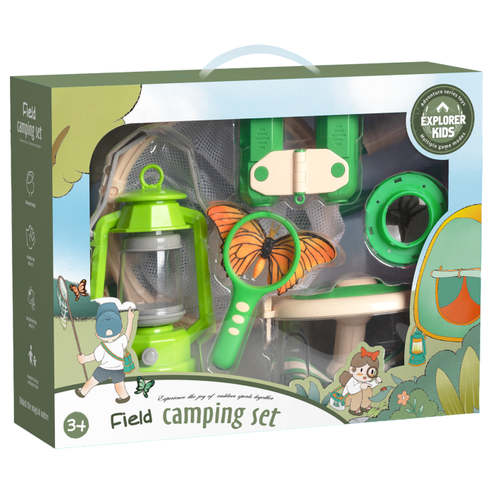 Le Byomic Kids Camping Set – 8 pièces comprend tout ce dont un jeune aventurier a besoin : 1x jumelles, 1x lanterne, 1x insecte, 1x papillon, 1x loupe, 1x filet à papillons et 2x boîtes à insectes. Tout est soigneusement emballé et prêt pour la prochaine exploration en plein air.
